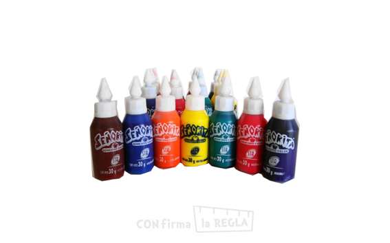 Presentación y Colores: Pack con 12 frascos de 30 g. Unicolor Pack con 12 frascos de 30 g. Surtido primario (3 Rojo, 3 Azul, 3 Amarillo, 3 Verde) Pack con 12 frascos de 30 g. Surtido Total (2 Rojo, 2 Azul, 2 Amarillo, 2 Verde, 2 naranja, 1 Marrón, 1 Violeta)