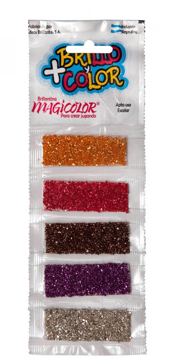 Brillantina elaborada con productos minerales, carbonatos y silicatos naturales reconvertidos de óptima calidad que obtienen color por su tinción con pigmentos de última generación y alta tecnología.