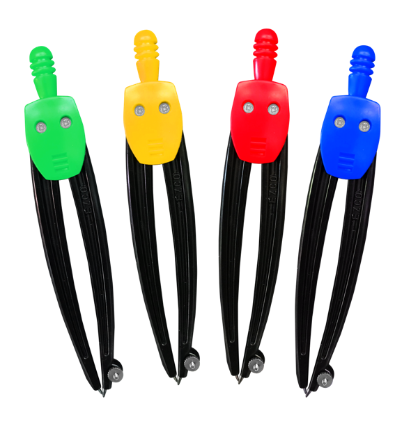 402100: Compás plástico Fiddo con mina presentado en exhibidor de 24 unidades, colores disponibles: azul, amarillo, verde y rojo.